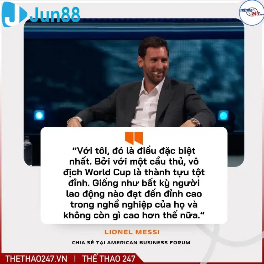 Xuất hiện tại America Business Forum ở Florida, Messi chia sẻ: “Thật khó để diễn tả cảm xúc ấy bằng lời. Danh hiệu đó có ý nghĩa vô cùng to lớn, không chỉ với cá nhân tôi, mà còn với gia đình, đồng đội và cả đất nước. Ai cũng thấy Argentina đã ăn mừng như thế nào, chúng tôi đã chờ đợi và khao khát khoảnh khắc ấy suốt nhiều năm.”